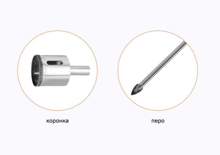 С такими материалами работать предельно сложно — их легко повредить. Например, керамика и стекло трескаются при перекосе сверла или перегреве. Поэтому для них используют только два вида сверл: коронки и перья. Коронки могут иметь диаметр от 13 до 80 мм и, как правило, покрываются алмазным напылением.