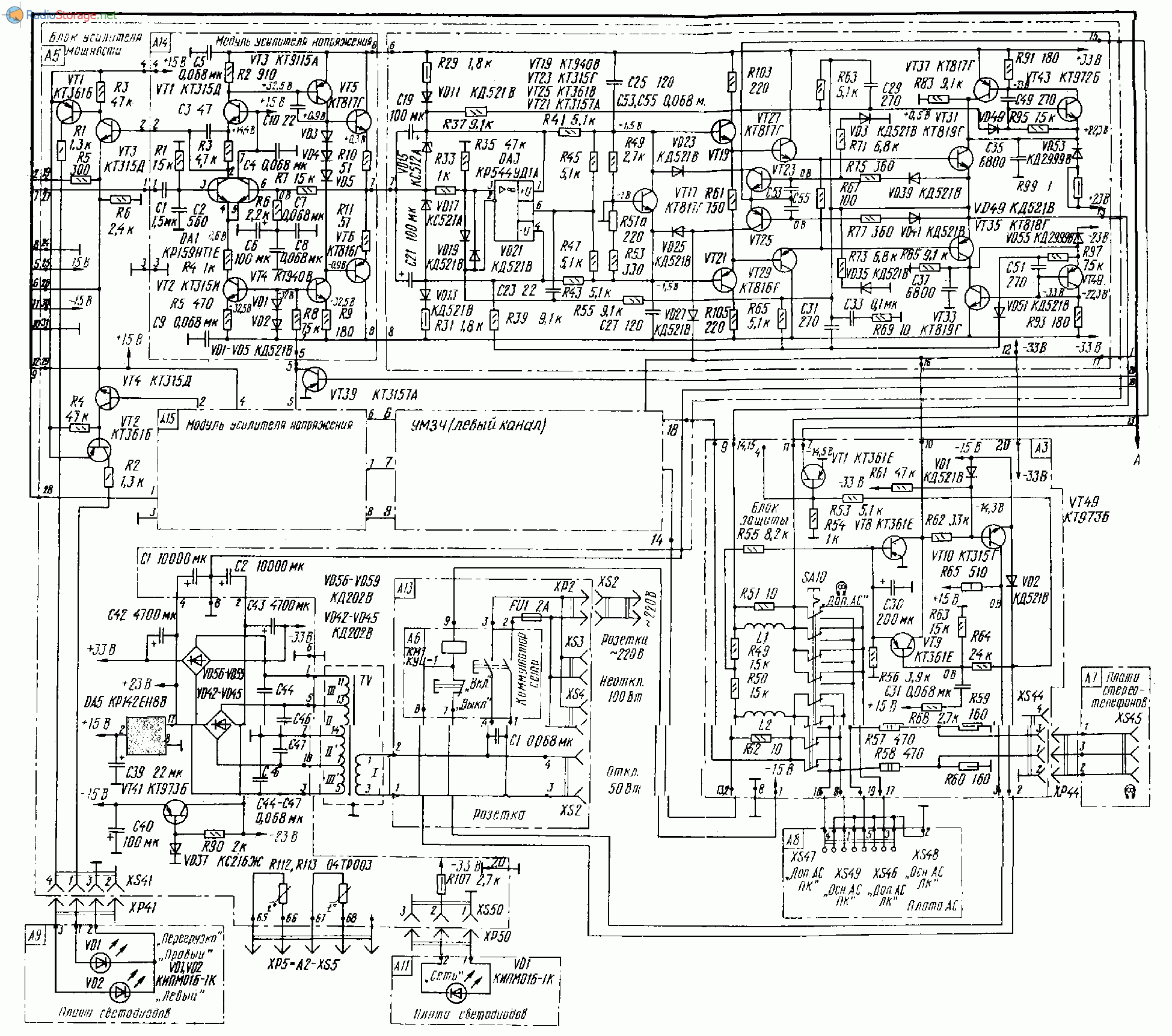 Принципиальная схема усилителя Вега 50У-122С показана на рис. 1, а и 1, б. Он состоит из шести блоков (коммутации А1, регуляторов А2, тембра А4, входов А10, усилителя мощности А5, защиты A3), четырех плат (AC A8, светодиодов А9, A11 и телефонов А7), пульта управления А12, а также розетки А13 с коммутатором сети А6.