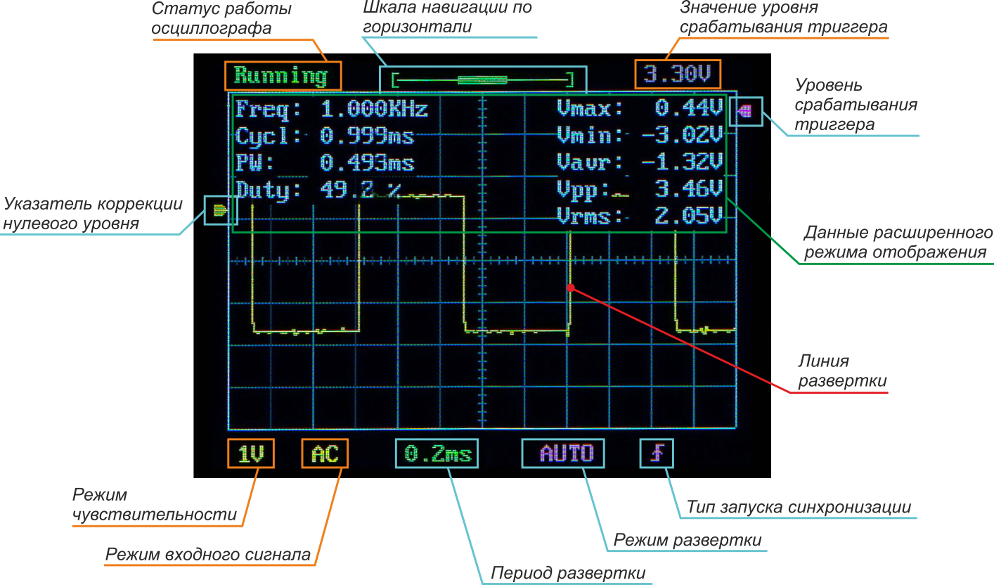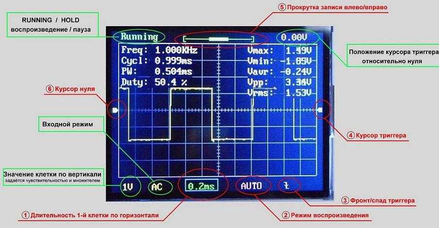 Что касается параметров измеряемого сигнала в рабочей области экрана — разберёмся, что они означают:Freq — собственно частота сигнала;Cycl — время периода;Pw — время полупериода;Duty — коэффициент заполнения (западный аналог скважности, 50% равен скважности 2);Vmax — Максимальное амплитудное значение сигнала;Vmin — Минимальное амплитудное значение (максимальное отрицательное);Vavr — Среднее напряжение;Vpp — Значение от Vmin до Vmax, если размах будет от -5 В до +5 В, то это значение получается 10 В;Vrms — Среднеквадратическое напряжение;