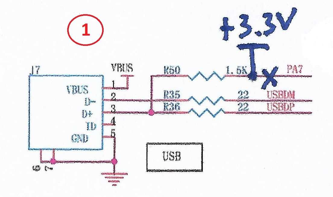 1) Режем одну дорожку, соединяющую R50 и PA7 микроконтроллера, и соединяем эту ножку R50 c питанием +3,3В (Рис.2 и Рис.3). Это необходимо по двум причинам: порт PA7 нужен для одного из входов АЦП, подача постоянного питания на R50 позволит использовать USB и в режиме загрузчика прошивки.