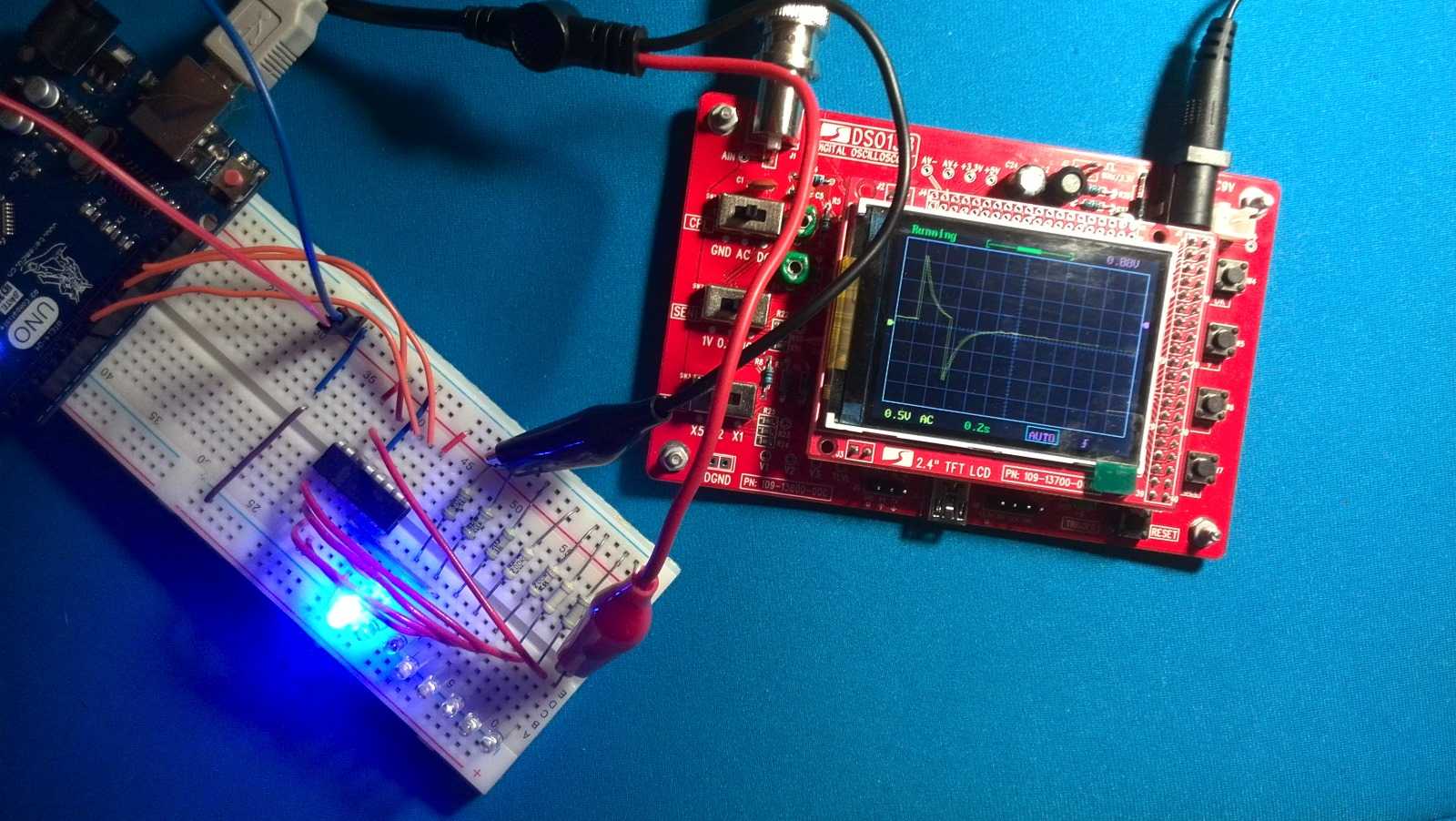 На этом настройка осциллографа DSO138 закончена. Давайте проверим его в боевых условиях. Подключим щупы осциллографа к работающей электрической схеме и посмотрим сигнал.