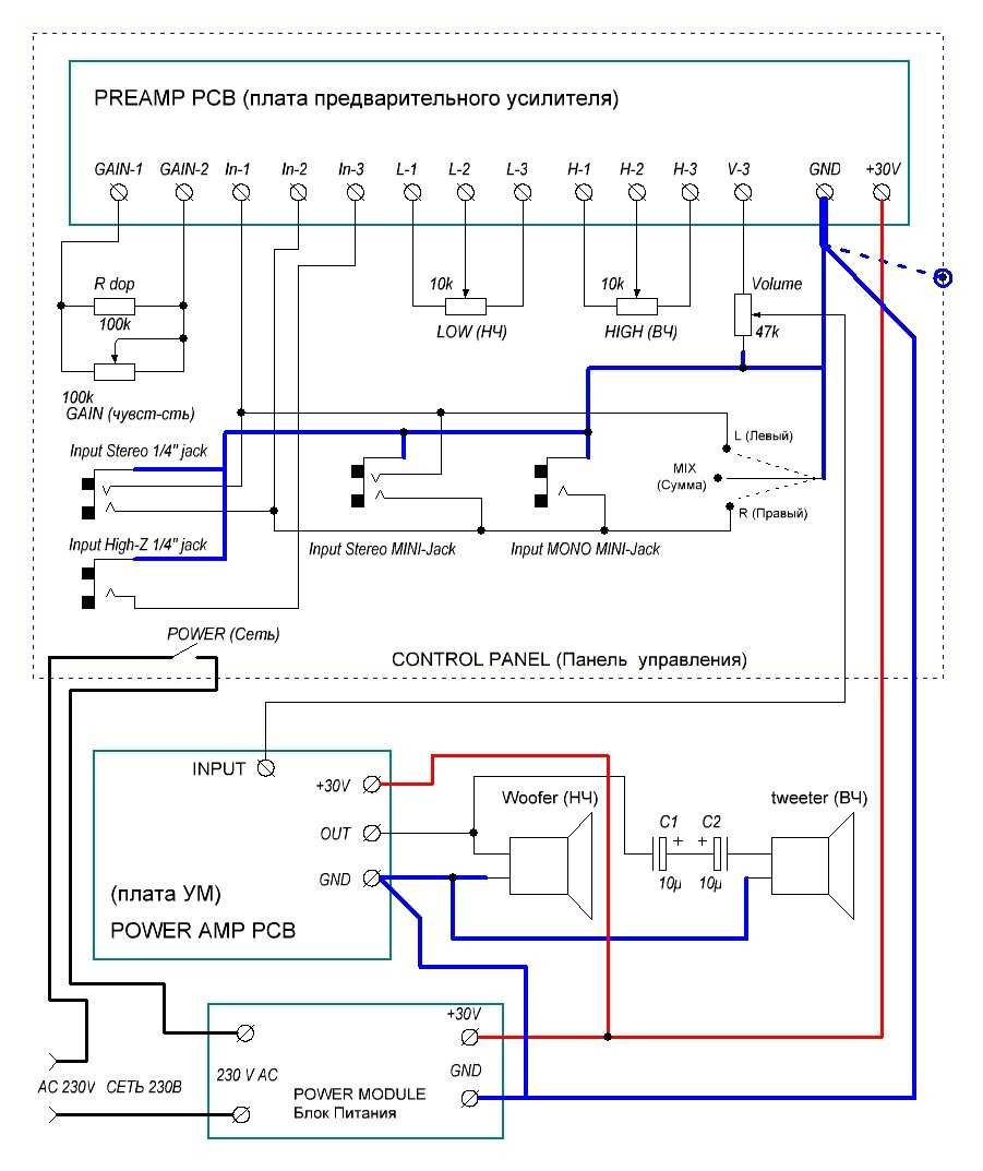 После изготовления всех модулей комбика (блока питания, преампа, усилителя мощности и панели управления) необходимо произвести сборку устройства. Ниже приведена схема соединений между платами и блоками комбика.