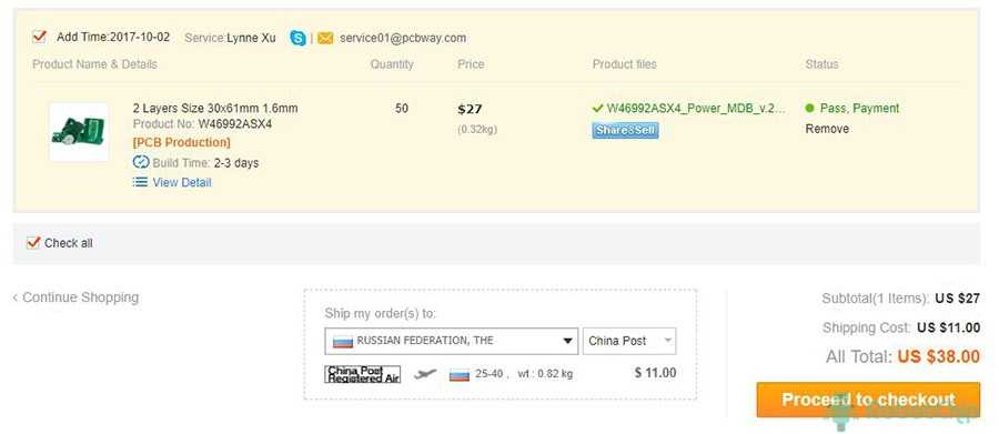 Как оплачивать, выбирать вам. Расскажу как оплатит через «Aliexpress», первым делом написал «service01@pcbway.com», о номере своего заказа и спросил как оплачивать.