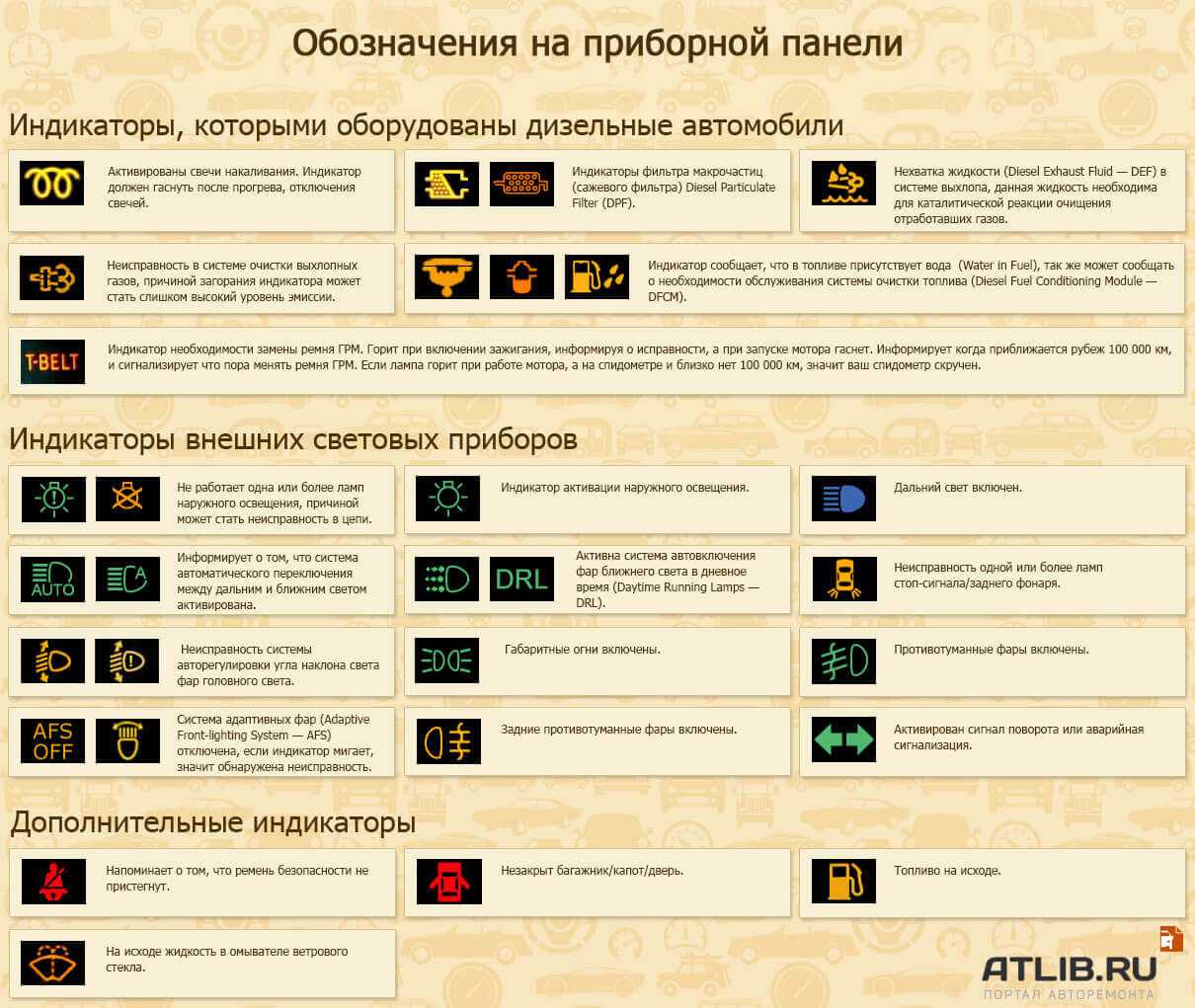 Этот материал является информативным для большинства автовладельцев. И хотя здесь не представлены абсолютно все возможные значки всех существующих машин, Вы сможете самостоятельно разбираться в основных обозначениях приборной панели авто, и не будите бить тревогу, когда увидите, что вновь горит значок на панели.