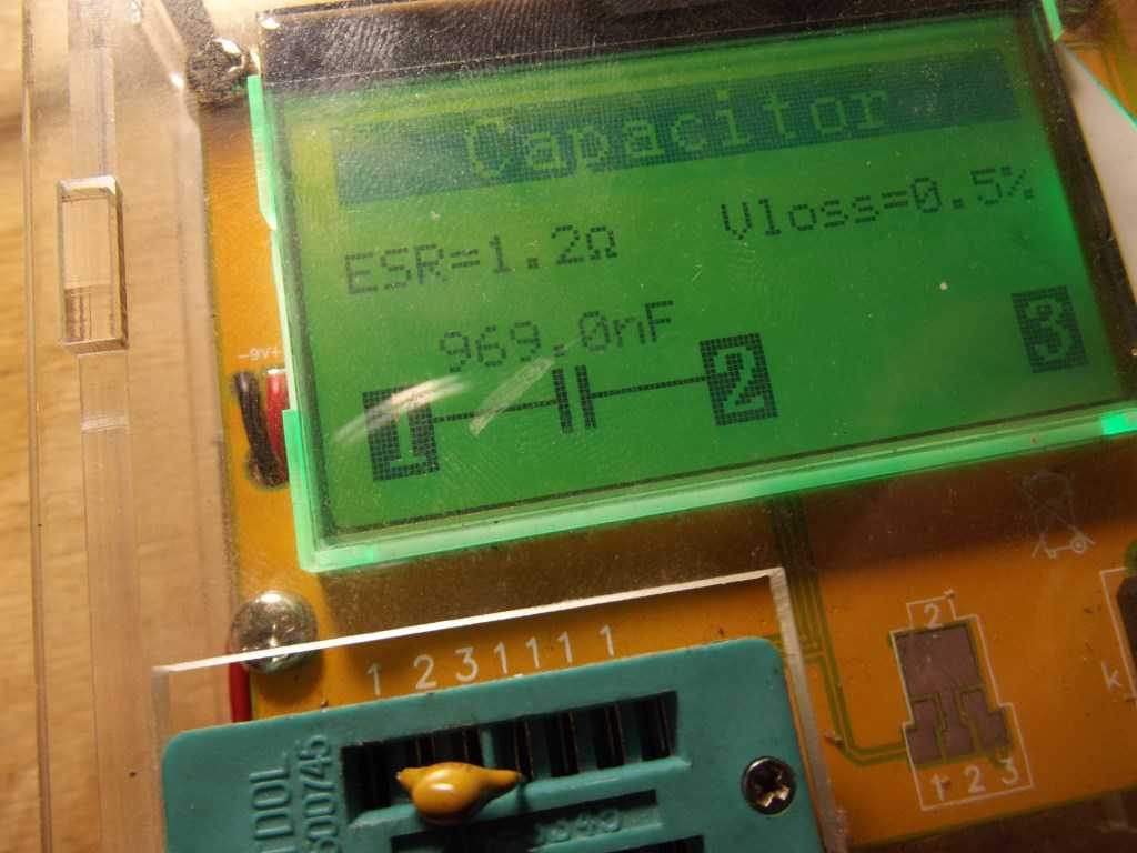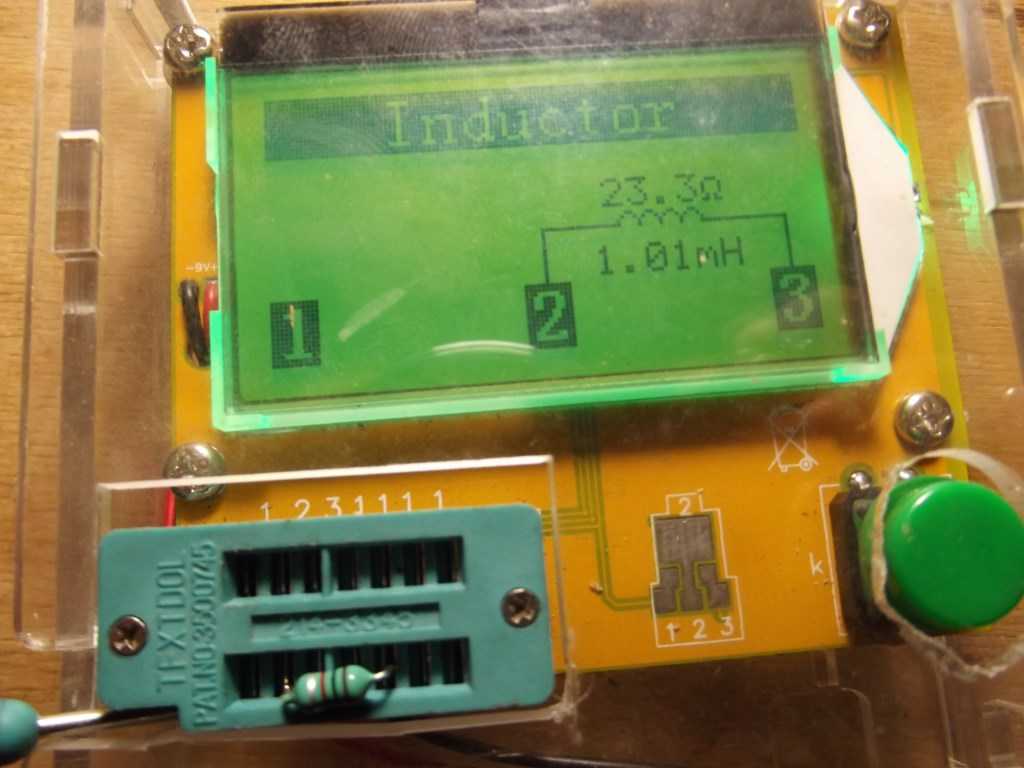 Давайте по формуле Томсона посчитаем резонансную частоту нашего последовательного колебательного контура. Для этого я буду использовать свой RLC-транзисторметр.
