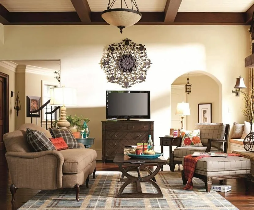 Гостиная комната в направлении ретро оформляется с ограниченным количеством мебели. На нее обязательно стелются накидки и покрывала с клетчатыми мотивами и правильными геометрическими орнаментами.