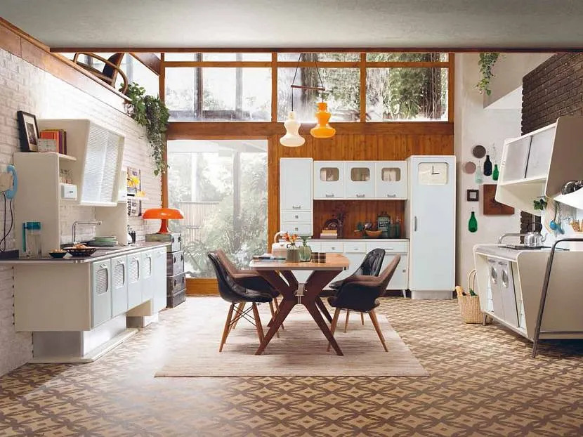 Для облицовки стен в кухне стараются использовать однотонную краску или обои. Материалы должны быть универсальными, если вы не определились к какому десятилетию хотите привязать ретро-стиль в интерьере.