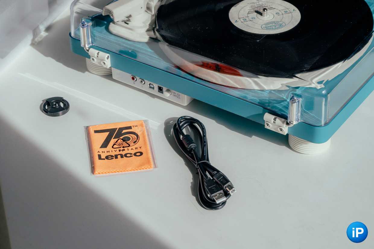 Провод с USB-B на USB-A для оцифровки песен. Тряпочка для протирки пластинок. Запасная игла, когда сотрётся комплектная. И провод с блоком питания, разумеется.