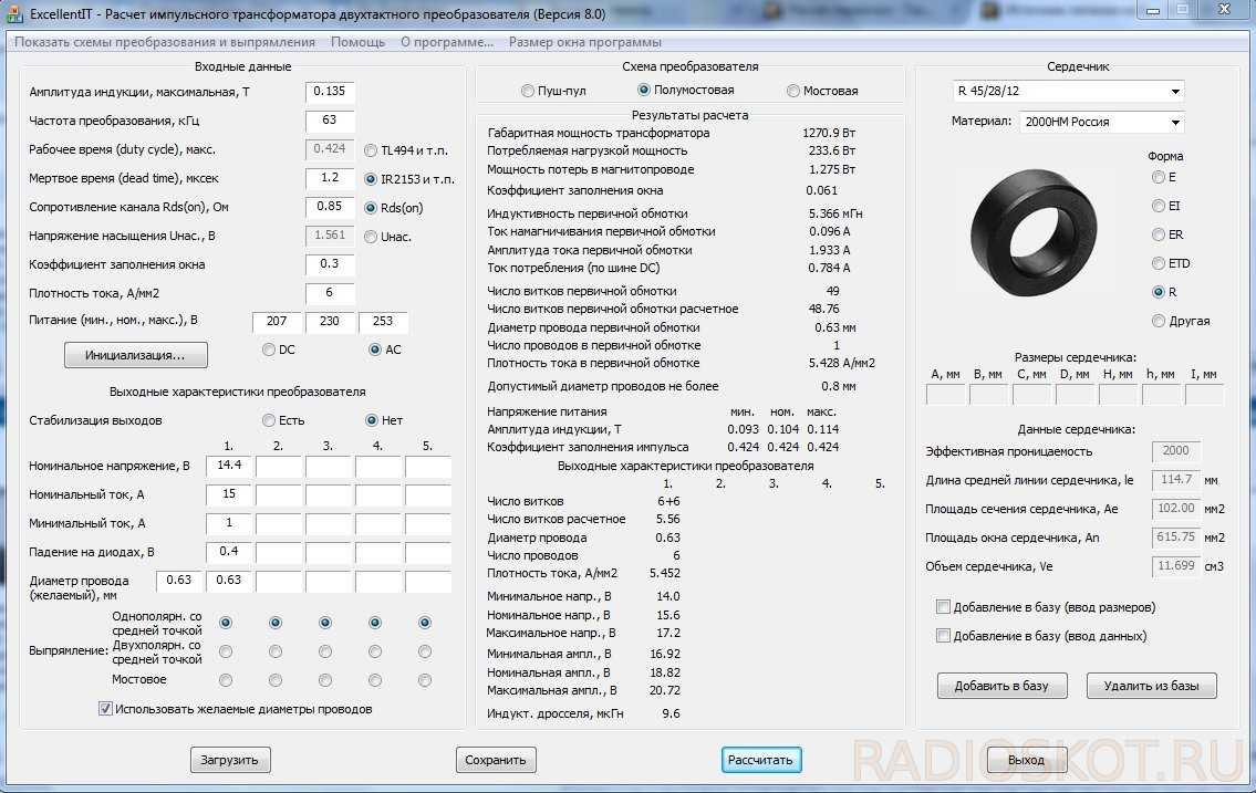 Теперь самое интересное в ИИП – трансформатор, хотя ничего сложного тут нету, просто надо понять, как его правильно мотать, и всего то. Для начала нужно знать, чего и сколько наматывать, для этого есть множество программ, однако самая распространённая и пользующаяся популярностью у радиолюбителей это – ExcellentIT. В ней мы и будем рассчитывать наш трансформатор.