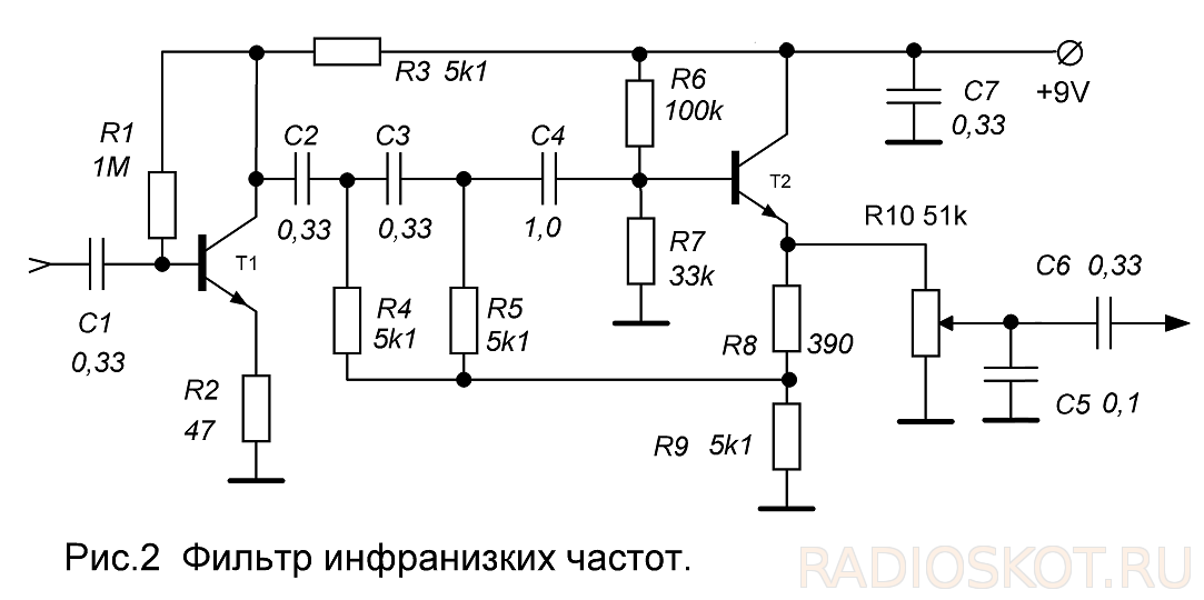 Это позволяет избавиться от соответствующих колебаний очень низких частот, которые практически не воспроизводятся применяемыми динамиками, тем не менее вызывают ненужные нам колебания их диффузоров с большой амплитудой, что приводит к большим перегрузкам и искажениям сигнала. Частота среза фильтра задаётся элементами С2, С3, С4, R4, R5, а режим работы транзистора Т1 подбором номинала резистора R3 (следует выставить на коллекторе этого транзистора примерно половину напряжения питания каскада, т. е. 4,5 V). На выходе фильтра включен переменный резистор (может быть от 10 до 100 кОм, это зависит от входного сопротивления включенного за ним усилителя мощности). С его помощью можно регулировать уровень усиления низких частот относительно СЧ-ВЧ для выравнивания суммарной частотной характеристики всей системы. Шунтирующий конденсатор C5 после переменного резистора нужен для дополнительного среза частот выше 1000 Гц, чтобы убрать возможные вч-шумы и наводки, а разделительный C6 мкФ можно не ставить, если на входе усилителя мощности такой конденсатор уже используется. Для снижения собственных шумов, схемы выбраны без использования оксидных электролитических конденсаторов в сигнальных цепях (за исключением входного конденсатора С1 первого фильтра, но и его можно заменить при желании на обычный, например, плёночный). Транзисторы в обоих фильтрах можно применить любые маломощные n-p-n структуры, но, желательно с высоким коэффициентом усиления и низким уровнем собственных шумов (2РС1815L, BC549C, BC550C, BC849C (smd) , BC850C (smd), BC109C, BC179C и др.)