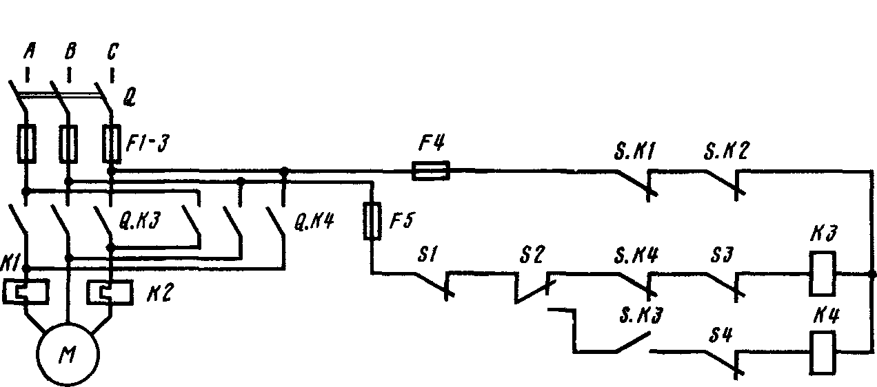 Рис. 6. Привод двигателя трехфазного тока: М — электродвигатель; Q — рубильник; F1—F 5 — предохранители; ΚΙ, К2— тепловые реле; КЗ, К4— пускатели; SI — кнопка «стоп»; S2—выключатель «вперед», «назад»; S3, S4—конечные выключатели