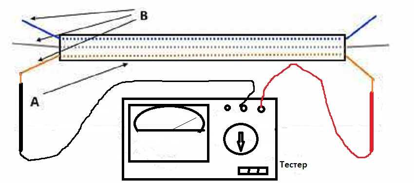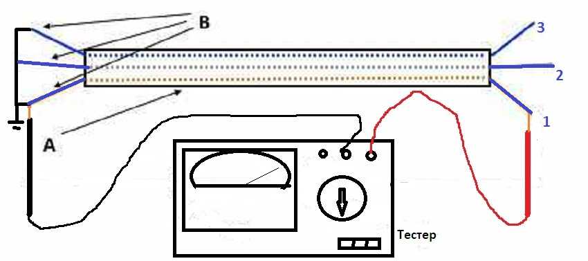 Прозвонка кабеля с цветными проводами, схематичное подключение щупов к одноцветным проводам на разных концах кабеля. А – изоляция кабеля. В – Отдельные жилы кабеля с цветной изоляцией.