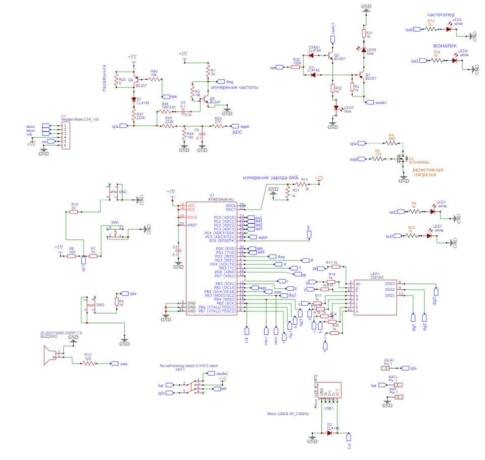 Вот решил сделать себе контрольку- пробник для работы с автомобилями.Сначала я определился с функциями которые мне нужны вот примерный список:1. Вольтметр2. Прозвонка3. Светодиоды синий и красный4. Зуммер5. Фонарик6. Генератор частоты7. Резистивная нагрузка8. Распознавание импульсных сигналов9. Крепкий корпусСначала нарисовал схему. Я решил использовать не дорогие и доступные детали. Микроконтроллер самый доступный атмега8. Семисегментный индикатор. Несколько светодиодов, резисторов, и транзисторов. А также зуммер.