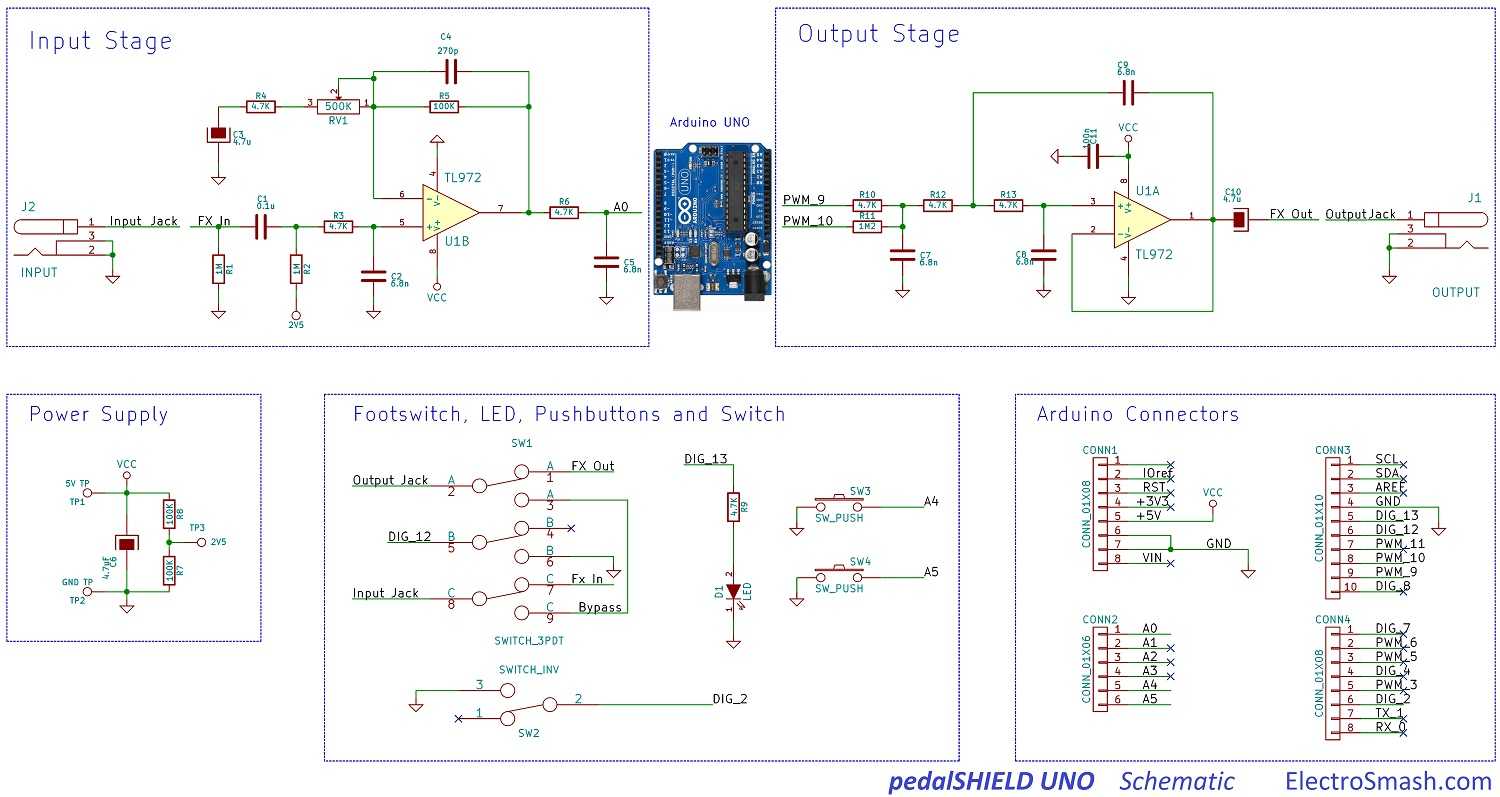 Теперь для Arduino Uno можно собрать специальный шилд pedalSHIELD UNO, исходники которого находятся в открытом доступе. С помощью pedalSHIELD UNO можно довольно легко сделать программируемую гитарную педель эффектов. Этот шилд собирается на основе широко доступных компонентов и не требует глубоких знаний в программировании алгоритмов цифровой обработки сигналов. Вот так внешне выглядит шилд pedalSHIELD UNO: