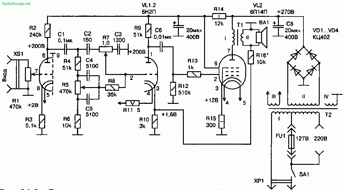 Рис. 1. Принципиальная схема усилителя звуковой частоты мощностью 5 Вт на двух электронных лампах 6Н2П и 6П14П.