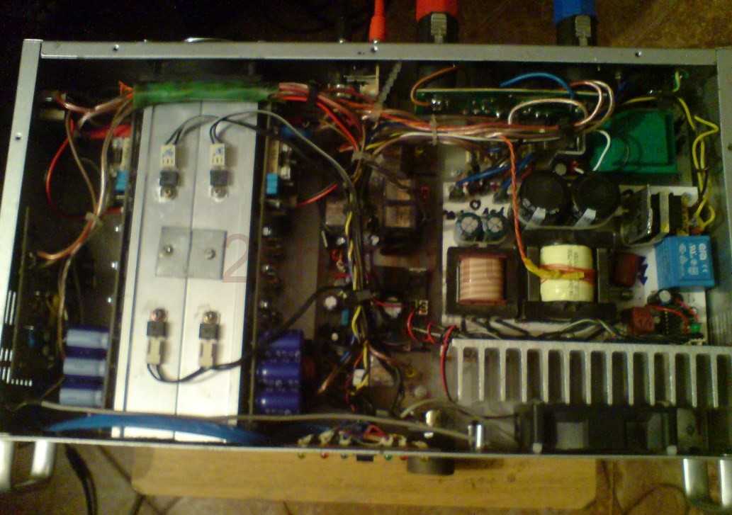 Представляем полностью цифровой усилитель НЧ класса D на мощность обеих каналов 1000 Вт. Корпус был взят от предыдущих проектов не слишком устраивавших по работе усилителей. Инвертор также используемая из предыдущих проектов, только эта версия была улучшена. Управление на SG3525 скопировано и чуть модифицировано с автомобильного усилителя Grundig PA240 + управляющий трансформатор и транзисторы. Блок питания 2×75 В, постоянная мощность выхода 1100 Вт и сердечник ETD49 прекрасно делают свое дело. Все работает с частотой 60 кГц. Полумостовая топология.