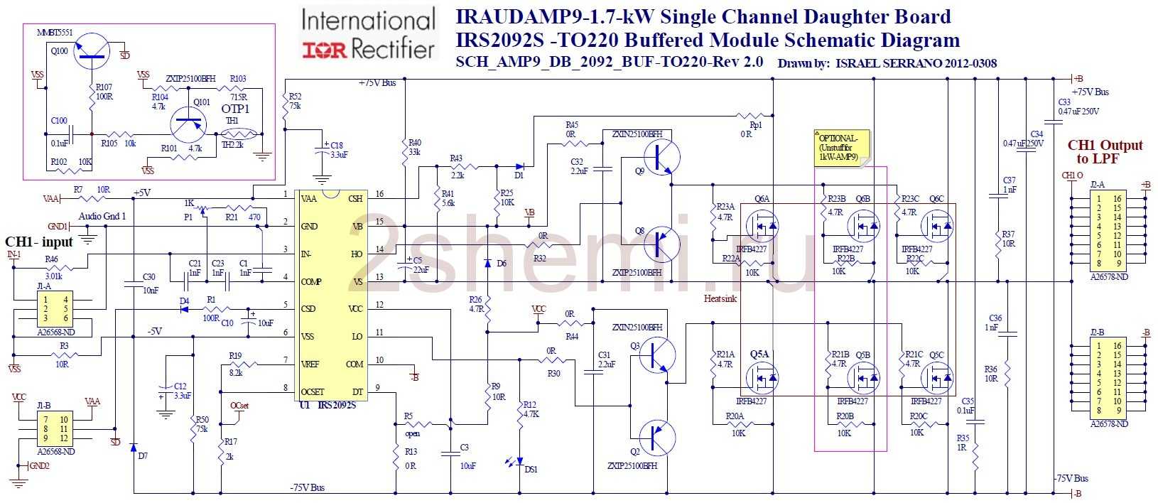 Модули УМЗЧ класса D сделаны в соответствии с имеющимся проектом IRAUDAMP 9 (скачать полную документацию), плюс внесены минимальные изменения. Три пары транзисторов IRFP4332 на канал работают с тактовой частотой 300 кГц. DT 105 нс. Основа усилителя — IRS2092 + TC4420. Дроссель БП в феррите, индуктивность 22uH / 30A.