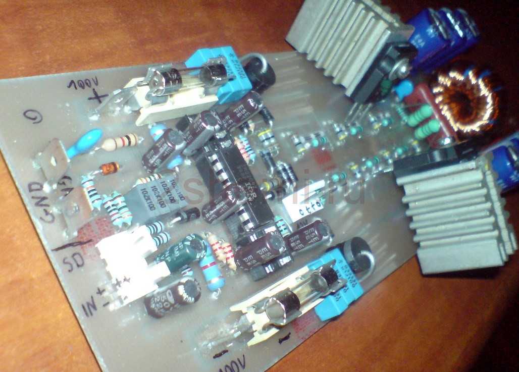 На фото ниже показана полностью собранная печатная плата УМЗЧ. С помощью TIP35 и TIP36 транзисторов выходного каскада обеспечивается надежность при работе в самых тяжелых сценических условиях. Другие особенности схемы включают в себя защиту от короткого замыкания — компоненты смещения диодов D2 и D3.