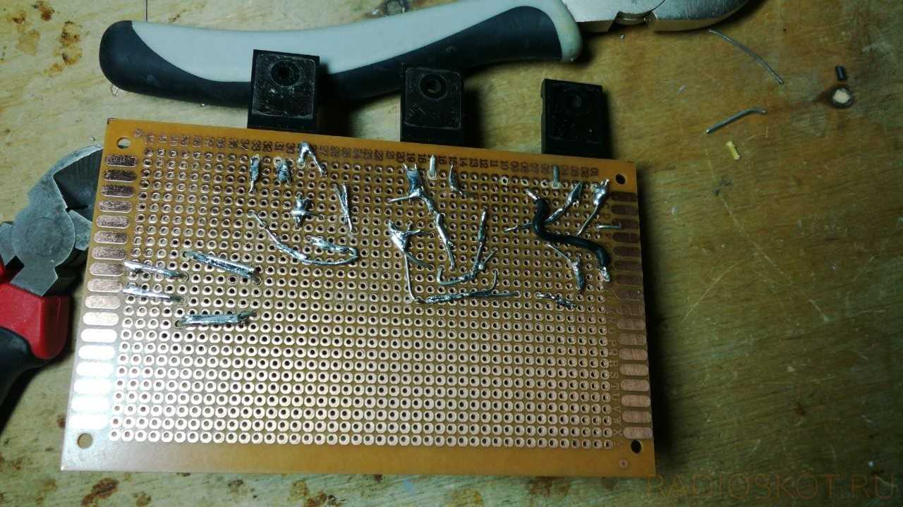Прикручиваем стойки, на которых будет крепится плата, формуем ноги у транзисторов и паяем лежа на плоскости. Победа.
