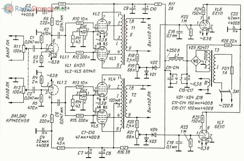 Сигнал с регуляторов громкости (переменные резисторы R1.1 и R1.2) в каждом канале через разделительный конденсатор подается на сетку триода лампы VL1. Усиленный сигнал с резистора нагрузки R6 (R7) через конденсатор С5 (С6) поступает на управляющую сетку одной из выходных ламп VL2 и VL3 (здесь и далее указаны элементы лишь правого канала — верхнего по схеме).