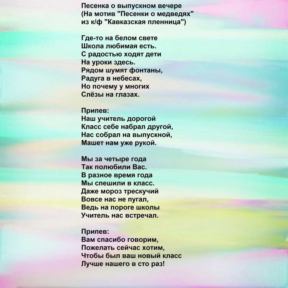 Друзей своих любимых мы обнимаем нежно, Ведь в школе наши судьбы на много лет сплелись. Сияет купол неба, красивый и безбрежный… Как здорово, что все мы здесь сегодня собрались. Родные педагоги из милой нашей школы, Сегодня мы уходим от вас в большую жизнь. Нам с вами расставаться, поверьте, очень больно. Вам о любви своей сказать мы вместе собрались. Вы жить нас научили, морали не читали, Вы просто с нами были открыты и честны. И нам понять друг друга всегда вы помогали, За это мы спасибо вам сказать сейчас должны