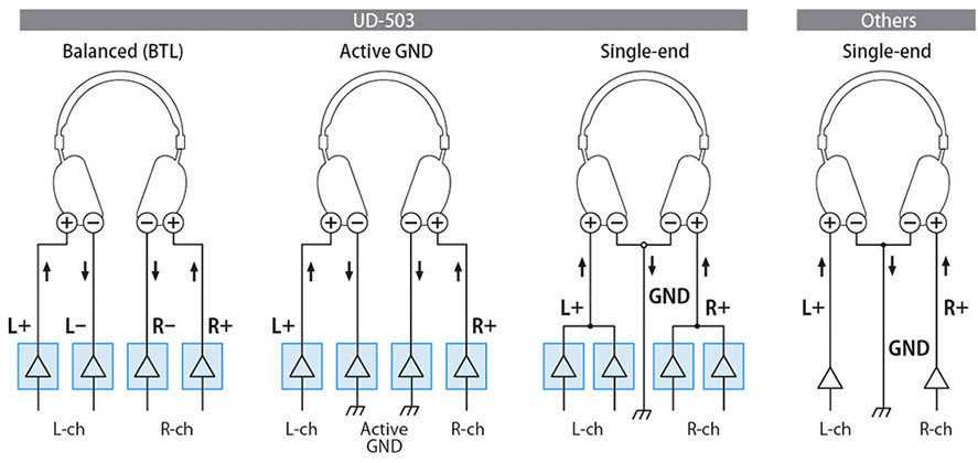 Хорошим примером реализации выходов в балансном усилителе служит модель TEAC UD-503. Фирменная схемотехника позволяет максимально эффективно использовать все возможные варианты использования в любой ситуации. При балансном подключении тракт получается полностью балансным.