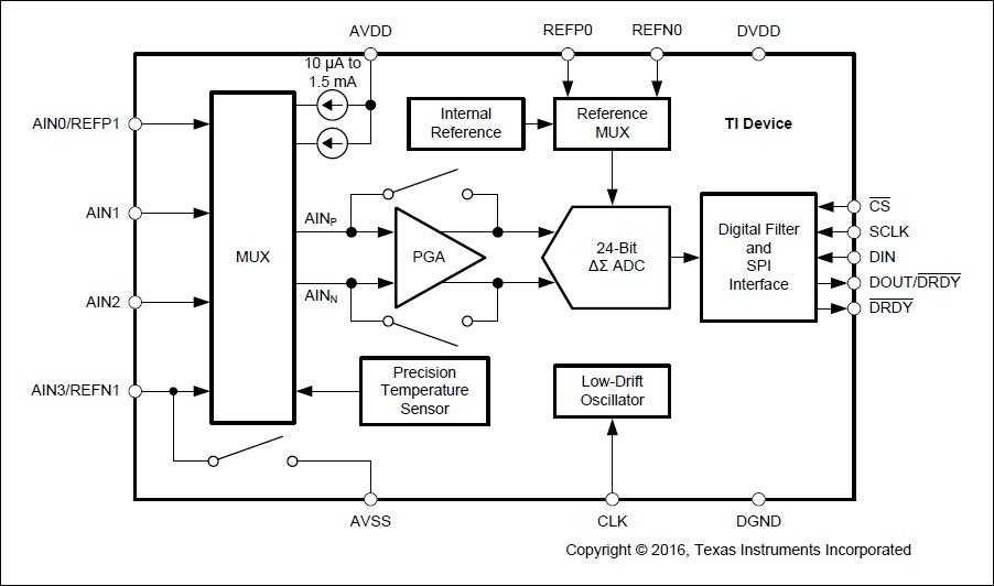 Микросхема ADS1220 является прецизионным 24-битным аналого-цифровым преобразователем, который имеет 4 однополюсных канала или 2 дифференциальных входа. Также он имеет малошумящий программируемый усилитель, благодаря которому можно осуществить контролируемое оконечное усиление.Кроме того, он дает два режима преобразования: непрерывное и одиночное.Основные особенности ADS1220: