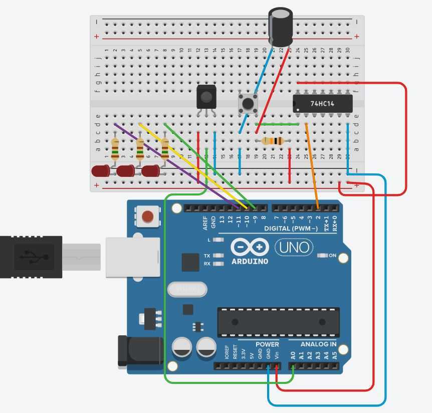 Схема кажется сложной и запутанной, но это не так. Мы подключаем кнопку прерывания к пину Arduino D2, используя аппаратное подавление дребезга контактов. К аналоговому пину A0 мы подключаем инфракрасный дальномер. И к пинам D9, D10 и D11 мы подключаем светодиоды через резисторы на 150 Ом. Мы выбрали именно эти контакты для светодиодов, потому что они могут выдавать ШИМ сигнал.Теперь рассмотрим скетч: