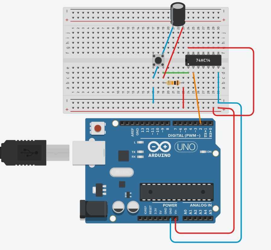 Если прерывание ожидает нажатия кнопки, то это может стать проблемой из-за дребезга контактов. В 6 уроке мы уже говорили о дребезге контактов. Тогда мы использовали функцию delay(), но в прерываниях данная функция не доступна. Поэтому нам придется подавить дребезг контактов немного усложнив схему подключения кнопки к пину прерывания. Для этого понадобится резистор на 10 КОм, конденсатор на 10 микрофарад,и инвертирующий триггер шмитта. Подключается все по следующей схеме: