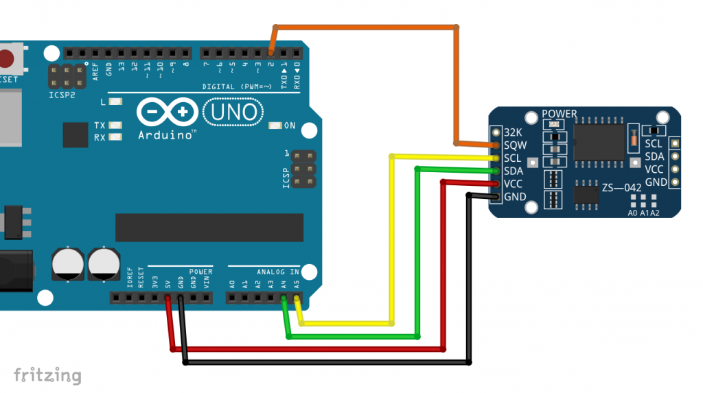 As you can see, the wiring is simple. Alternatively, you could connect VCC to 3.3 volts. But then charging the battery won’t work. Pull-ups for the I2C lines are not required. I use SQW as an interrupt output in some sketches.