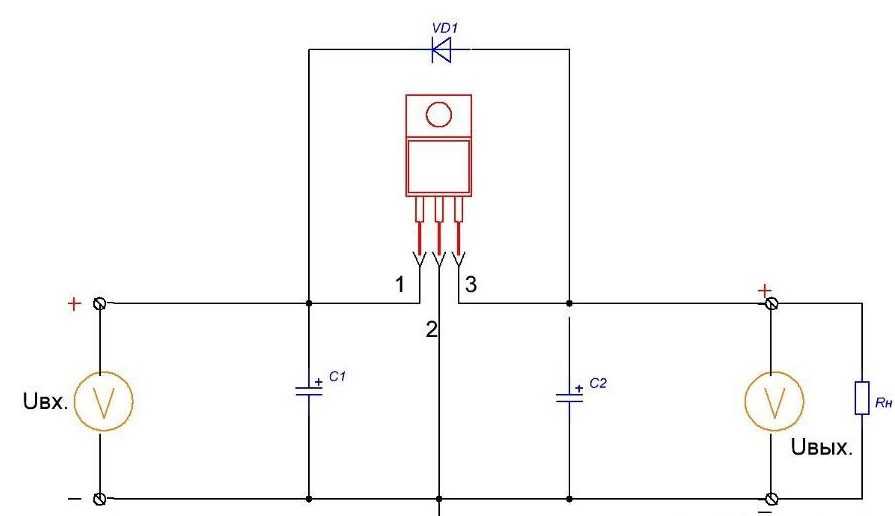 Устройства серии AMS1117 обладают защитой от краткого замыкания, а также тепловых перегрузок. Это крайне полезно и удобно, благодаря чему они, собственно, и пользуются огромным спросом. Схемотехника которая используется в этой серии стабилизаторов требует использования выходного конденсатора. Если между ними подключить резистор, то будет постоянный ток. Подключение ams1117 происходит по специальной схеме, расположенной ниже.