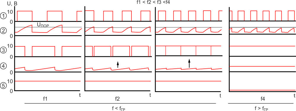 Более интересная задача — регулировка скважности. В приведённой схеме длительность импульса равна длительности паузы, скважность 50%