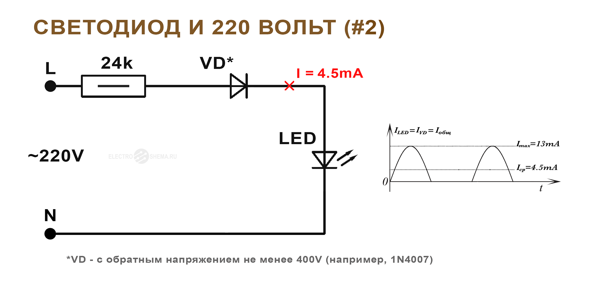 Не смотря на распространенное заблуждение, в отрицательные полупериоды сетевого напряжения, светодиод все-таки будет находиться в состоянии электрического пробоя. Но благодаря тому, что сопротивление обратносмещенного p-n-перехода защитного диода очень велико, ток пробоя будет недостаточен для вывода светодиода из строя.
