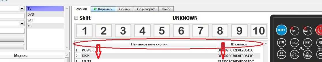 ПОИСК ПО КНОПКАМ — это поиск по взаимозаменяемым пультам, имеющих одинаковый сигнал как того же производителя, так и в других, в аналогичном или другом типах корпуса пульта. Откройте вкладку поиск, снимите с пульта сигнал кнопки «POWER», сигнал кнопки отобразится в цифровом виде слева вверху вкладки. нажмите кнопку «POWER» во вкладке «ПОИСК», слева отобразится список, совпадающих по сигналам кнопки «POWER», пультов. рекомендуется использовать для поиска сигналы следующих кнопок- «POWER, 1, VOL +, CH +, OK, MENU».