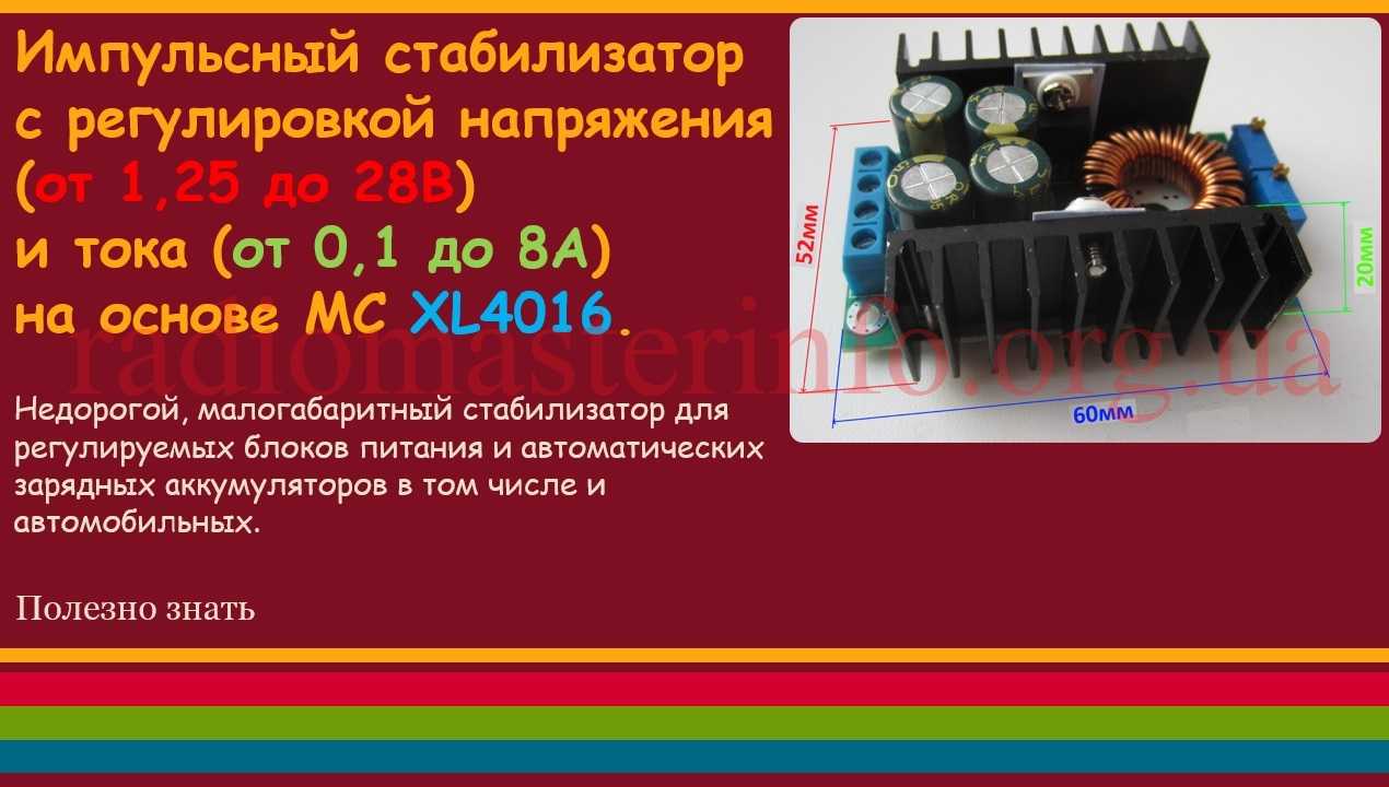 Импульсный стабилизатор, еще его называют понижающий DC-DC преобразователь XL4016, это малогабаритный, недорогой, высокоэффективный модуль с КПД до 95% на основе которого можно достаточно просто реализовать блок питания с регулировкой напряжения от 1,25 до 28В, а также ограничением (стабилизацией) тока от 0,1 до 8А, что позволяет ему выполнять функции автоматического зарядного устройства для аккумуляторов от самых малых (пальчиковых) до автомобильных. Стоит около 4$. Купить можно здесь.