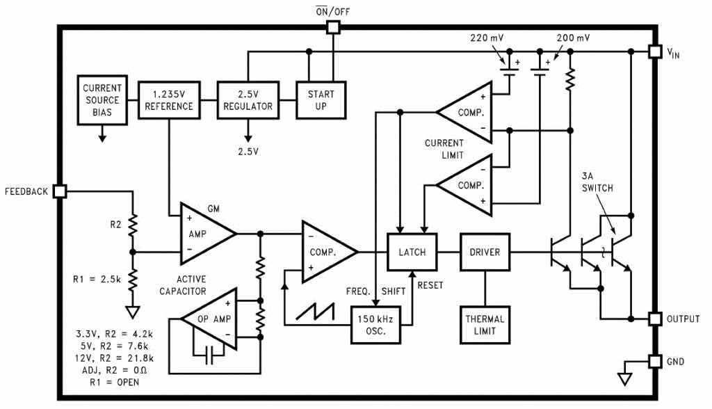 Микросхему удобно использовать как конвертерный step–down. сильный двухполярный ключ размещен внутри, нужно только дополнить регулятор еще несколькими компонентами — быстрым диодом, выходным и входным конденсаторами и т.д.