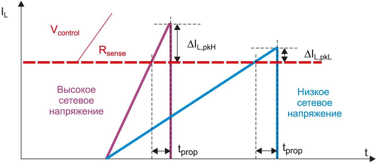 При расчете должна учитываться задержка распространения tprop (рис. 10) с момента, когда напряжение на токоизмерительном резисторе достигает установленного внутреннего порога Vcontrol, до момента выключения MOSFET, которая влияет на стабилизацию выходного тока. Рост пикового тока, вызванный tprop, необходимо скомпенсировать.