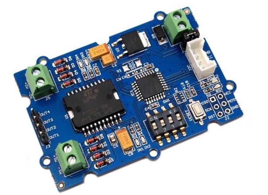 HG7881 – двухканальный драйвер, к которому можно подключить 2 двигателя или четырехпроводной двухфазный шаговый двигатель. Устройство часто используется из-за своей невысокой стоимости. Драйвер используется только для изменения направления вращения, менять скорость он не может.