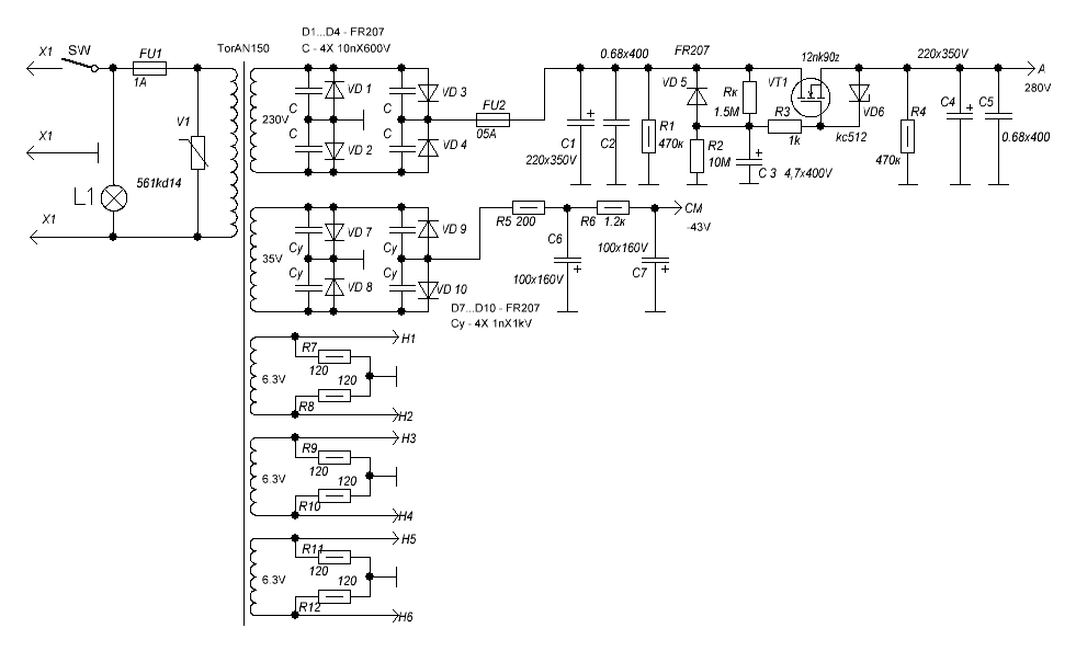 В выпрямителе напряжения я применил «электронный дроссель» на полевом транзисторе 12NK90Z и не стал упражняться с катушками индуктивности в виде «железных дросселей». Схема смещения и накальные цепи сделаны идентичными авторскому варианту.