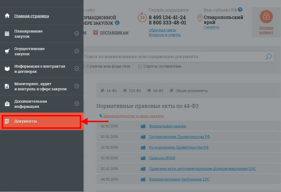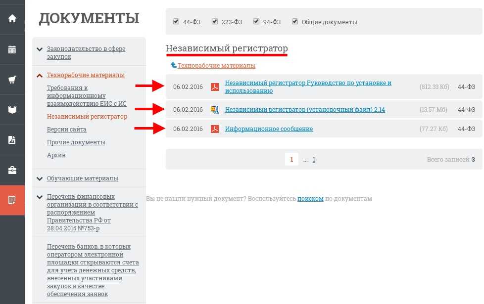 Скачать установочный файл, а также руководство по установке и использованию ПО можно с официального сайта Единой информационной системы (ЕИС). Для этого вам необходимо зайти на главную страницу сайта http://zakupki.gov.ru/ и в левом вертикальном меню выбрать раздел “Документы”.
