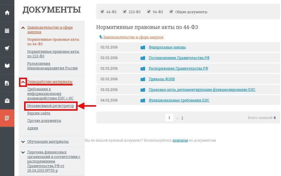Затем на появившейся странице в левой колонке найти пункт “Технорабочие материалы” и кликнуть левой кнопкой мыши по галочке, расположенной слева от этого пункта. Из выпадающего списка вам необходимо выбрать подпункт “Независимый регистратор” и кликнуть по нему.