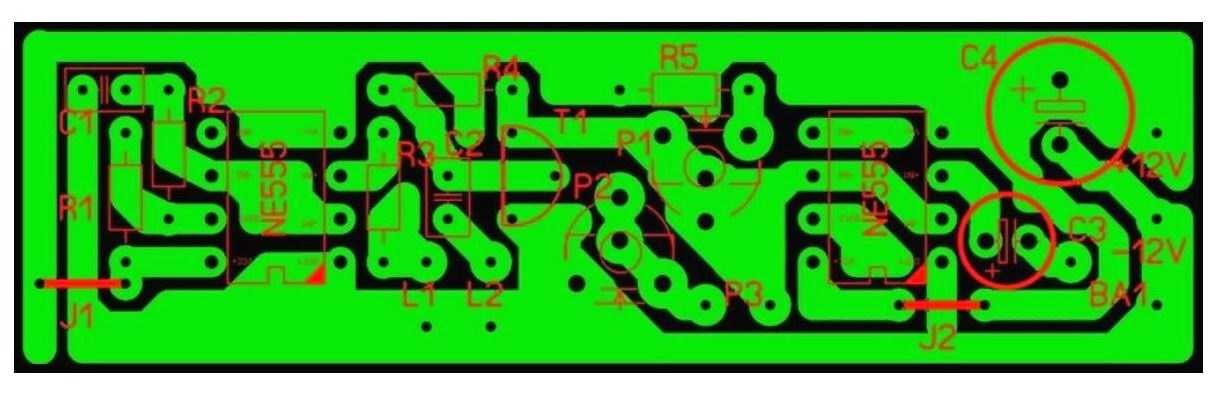 Для размещения радиодеталей используется печатная плата, которую легко изготовить своими руками. Для этого мы используем кусок фольги гетинакса, покрытый медной электроизоляционной фольгой. Переносим на него соединительные детали, размечаем точки крепления, просверливаем отверстия. Покрываем дорожки защитным лаком и после высыхания опускаем будущую доску хлорного железа для гравировки. Это необходимо для удаления незащищенных участков медной фольги.