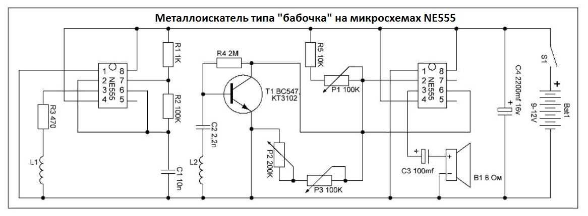 - По такому же принципу работает металлоискатель на транзисторе. На самом деле схема аналогичная, только NE555 заменен транзисторным генератором для КТ315.