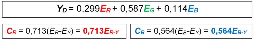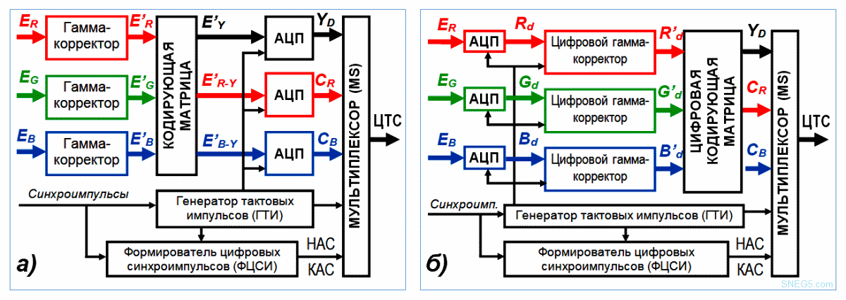 В устройстве, показанном на рис. 2.1 а, сигналы основных цветов ЕR, ЕG, ЕB с источника телевизионных сигналов (телекамеры) вначале поступают на гамма-корректоры (ГК). Сформированные сигналы Е’R, Е’G, Е’B в кодирующей матрице (КМ) преобразуются в сигнал яркости Е и цветоразностные сигналы Е’R-Y и Е’B-Y. Далее эти сигналы преобразуются аналого-цифровым преобразователем (АЦП) в цифровые сигналы YD, CR и СB, соответственно. На входах АЦП имеются дополнительные аналоговые устройства, выполняющие масштабирование и сдвиг сигналов в соответствии с соотношениями: