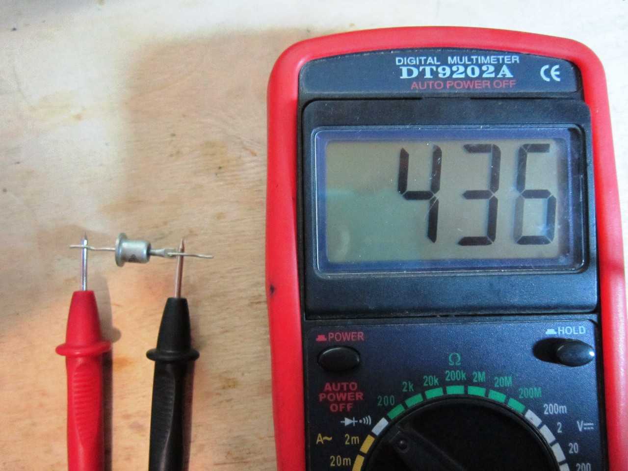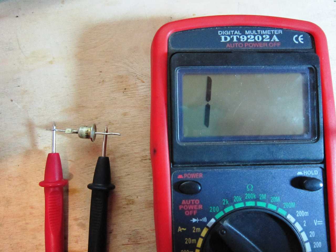 Без выпаивания мультиметром можно проверить электроды. Все что нужно, это выбрать на устройстве сопротивляющий измерительный режим с диапазоном в 2 кОм. Затем стандартно нужно присоединить красный проводок к части анода, а черный к части катода. Так будет показана цифра напряжения в омах. Как правило, при разрыве цепи измерение получается с цифрой выше допустимого или со значением 0.