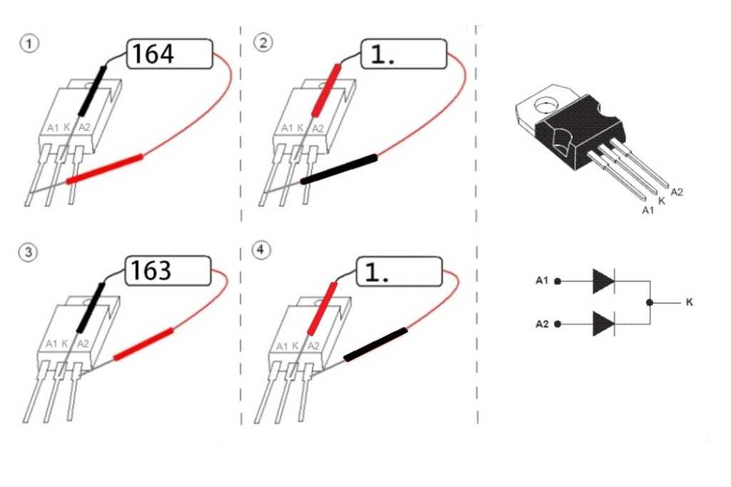 Схематическая проверка сдвоенного диода Шоттки с общим катодом изображена ниже . Мы видим , что поочередно необходимо проверить каждый из двух диодов .