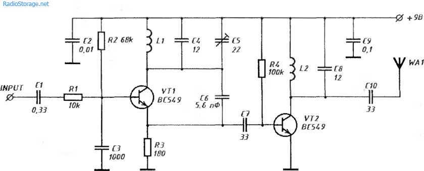 Антенна — кусок проволоки. Длина антенного провода должна быть пол метра. Схема, по сути, состоит из генератора, который работает на частотах около 80-120 МГц. На аудиовход подается сигнал микрофона, далее на усилитель звука на базе первого транзистора. Выход с коллектора подается в второй транзистор, где он модулирует высокие радиочастоты с промежуточным контуром при различной распределительной емкости транзистора. Схема работает надёжно, настраивается легко, поэтому и рекомендована для начинающих радиолюбителей. Ещё одна аналогичная схема показана ниже.