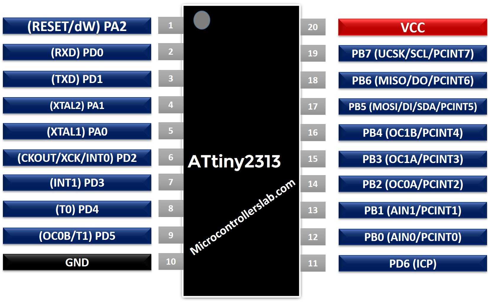 Following diagram shows the pinout of the ATtiny2313 AVR Microcontroller: