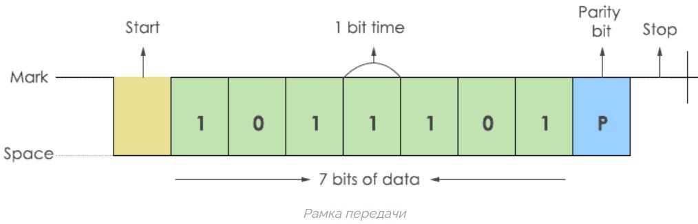 Передатчик отправляет по одному биту за раз. После отправки одного бита отправляется следующий. Таким образом, все биты данных отправляются на приемник с заранее определенной скоростью передачи. При передаче каждого бита будет определенная задержка. Например, чтобы отправить один байт данных со скоростью 9600 бод, каждый бит отправляется с задержкой 108 мкс. Данные добавляются с битом четности. Таким образом для отправки 7 бит требуется 10 бит данных.