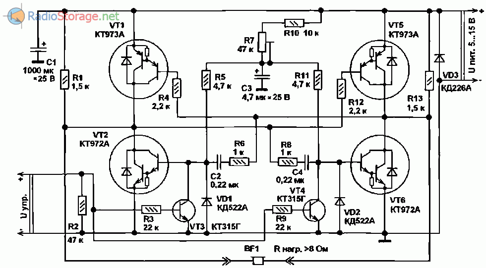 Рис. 3. Принципиальная схема эквивалентной замены транзисторов КТ972, КТ973.